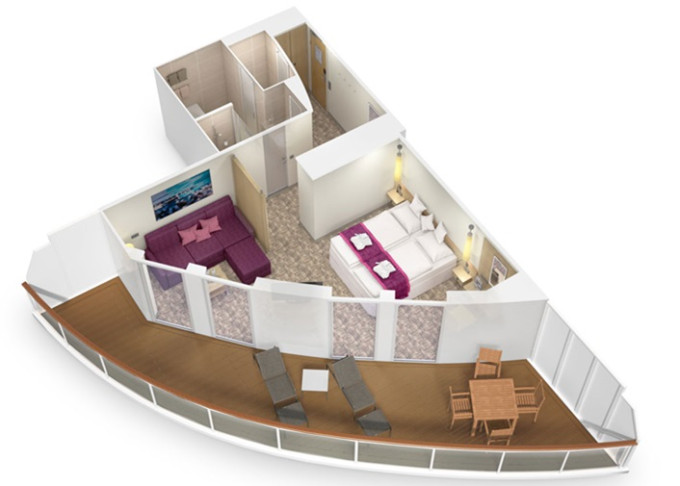 JA - Junior-Suite s balkónom PREMIUM 34 m² + terasa 27,5 m². 8. až 15. paluba. Max 4 osoby. Cenový model Premium + výhody Junior Suite. 3 430 € 1 715 € za osobu