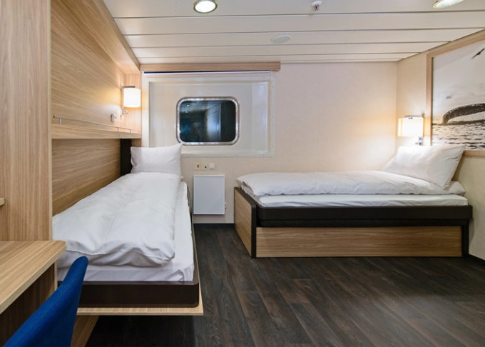 | P2D - Vonkajšia kajuta Arctic Superior 8-13 m². Neotvárateľné okno (môže byť limitovaný výhľad). Manželská posteľ, Tv, varná kanvica. 5. paluba. Max 2 osoby. | 9 074 € 4 537 € za osobu | ||
