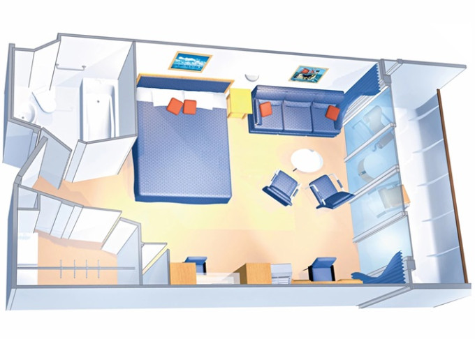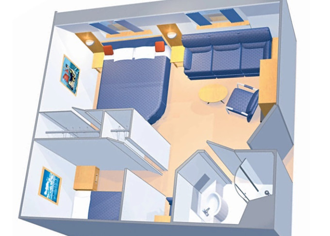 | VP - Ocean View Panoramic Suite (bez balkónu) 37,5 m². Celoplošné neotvárateľné okná. 12. paluba. Oddelená časť s poschodovou posteľou. Max 6 osôb. Výhody Suite. | 7 184 € 1 796 € za osobu |