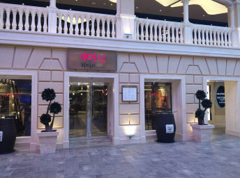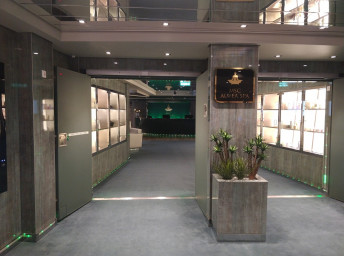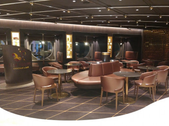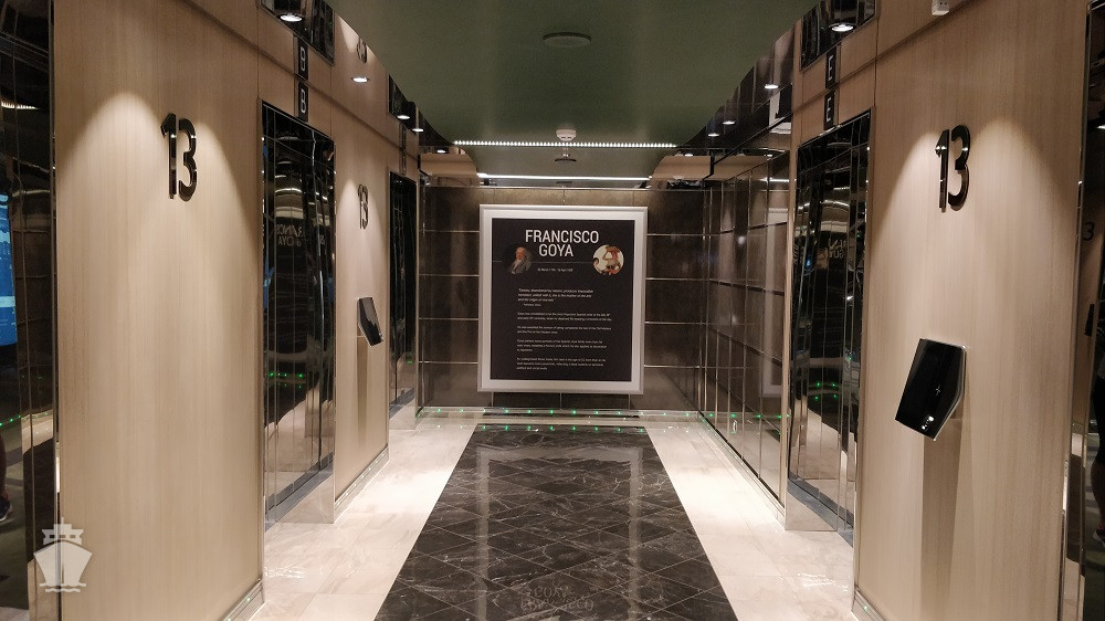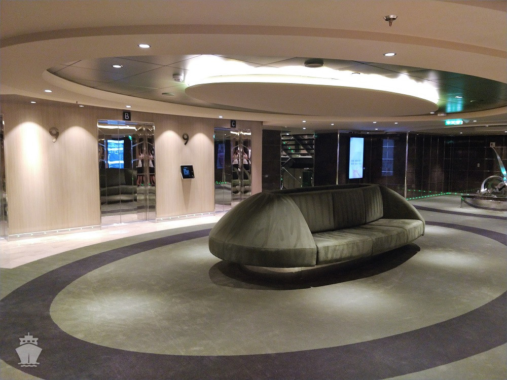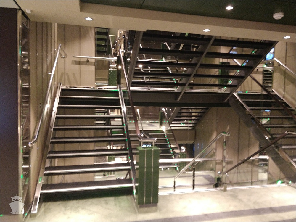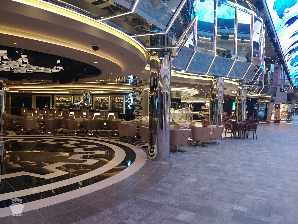 - Dvojúrovňová promenáda s reštauráciami, barmi a duty-free obchodmi, zastrešená 480 m² LED “digitálnou oblohou” s vizuálnymi show