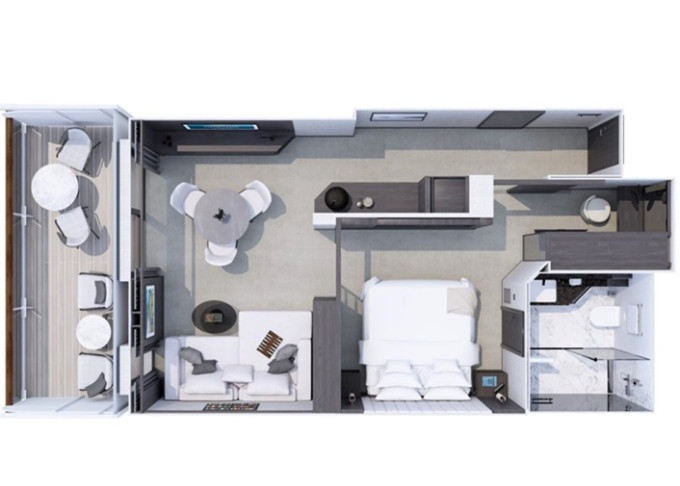 Ocean Residence - Cove Residence Suita + terasa so sedením a lehátkami 56 m². Spálňa s obývacou a jedálenskou časťou, šatník. Koktailová súprava, minibar, kávovar, vodná kanvica, ďalekohľad, sejf, kúpeľňa so sprchou. Závesy, svetlo, klimatizácia ovládané smart technológiou. Taška Technogym Case Kit. Fľaša šampanského na privítanie. Maximálna kapacita 3 osoby. 23 976 € 7 992 € za osobu