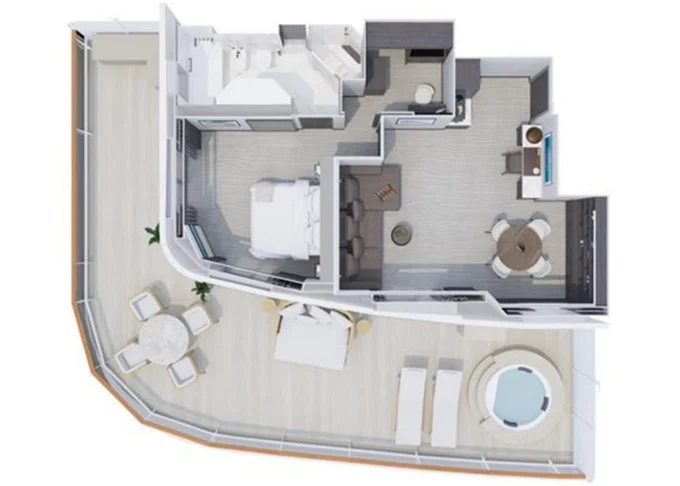 Ocean Residence - Cove Residence s vírivkou Suita + terasa s vírivkou a lehátkami 56 m². Spálňa s obývacou a jedálenskou časťou, šatník. Koktailová súprava, minibar, kávovar, vodná kanvica, ďalekohľad, sejf, kúpeľňa so sprchou. Závesy, svetlo, klimatizácia ovládané smart technológiou. Taška Technogym Case Kit. Fľaša šampanského na privítanie. Maximálna kapacita 3 osoby. 25 290 € 8 430 € za osobu